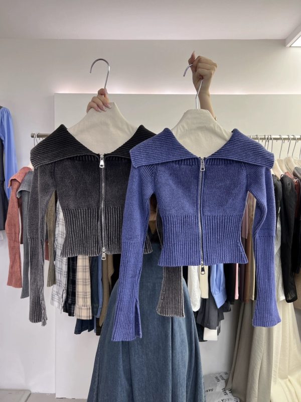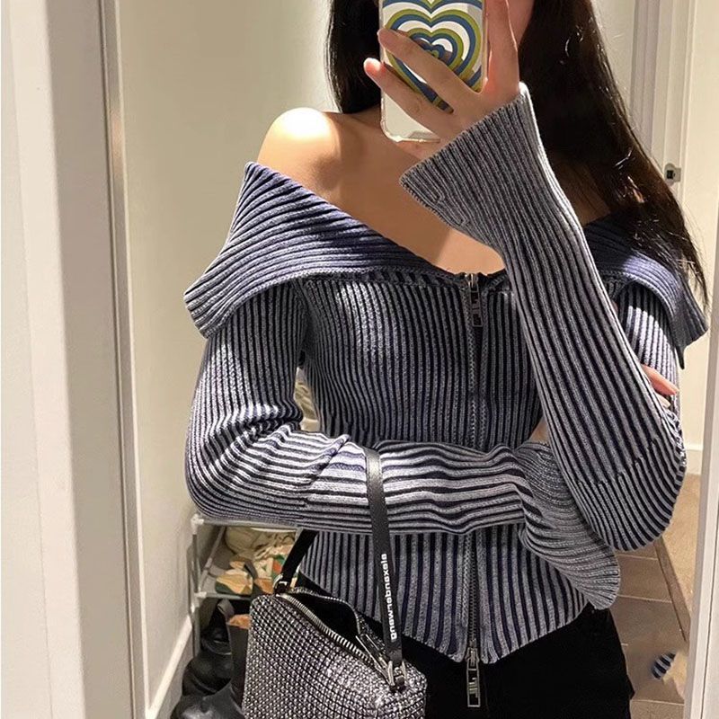 / Denim Blue Ribbed Long Sleeve Off The Shoulder Knit Top